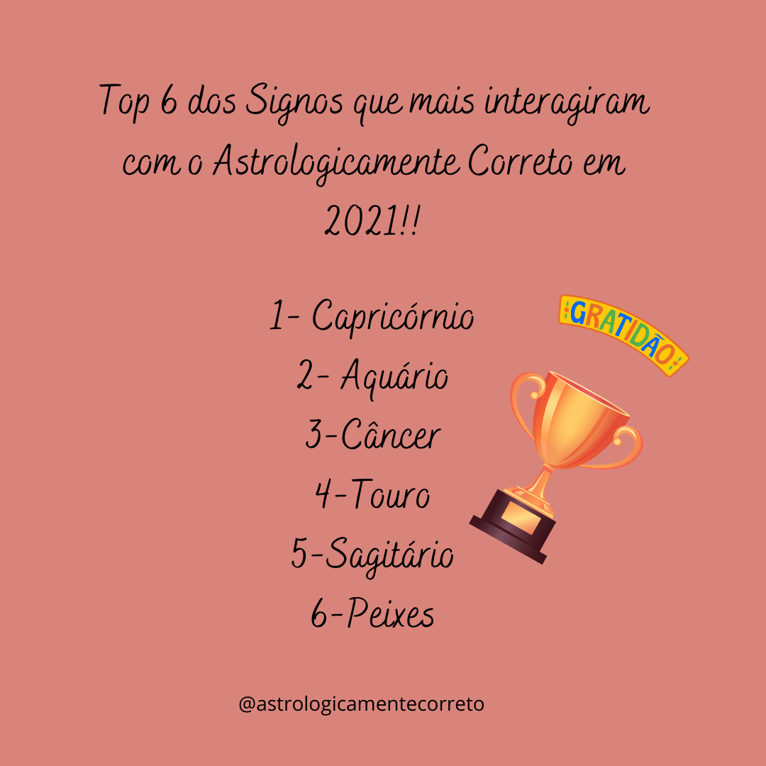 astrologicamentecorreto percebi que os signos que mais interagiram esse ano na página foram: Capricórnio, Aquário, Câncer, Touro, Sagitário e Peixes.